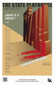 Breaking boundaries of sound and space, John M. Kennedy’s avant-garde composition poetically mirrors the dark and unexpected realities of Sartre’s world. Alicia Tycer’s libretto deconstructs the original linear narrative to reflect the multiplicity of space and time, while director Tanya Kane-Parry and members of her cutting-edge performance group, Opera del Espacio, create startling physical imagery, all supported by the Chamber Players of Los Angeles music ensemble. Students from the Department of Music, Theatre and Dance are participating in the development and workshop performances of this exciting new piece, working along side faculty and professional performing artists and designers, including famed international opera singer, Nicholas Isherwood; member of Urban Bush Women and Head of Dance at Cal Poly Pomona, Gayle Fekete; video designer E. Martin Gimenez (LA Opera, Cirque du Soliel, The Industry).